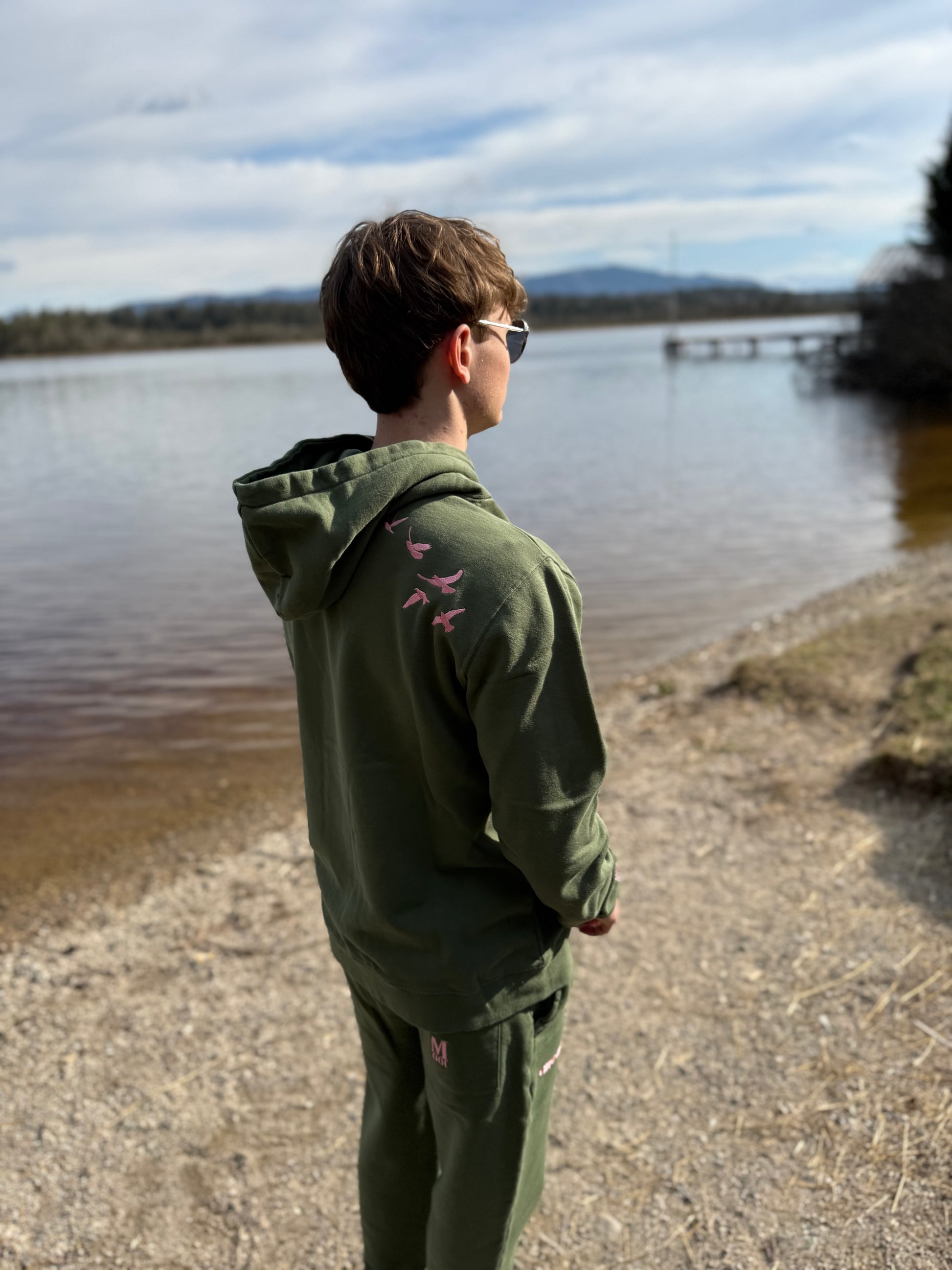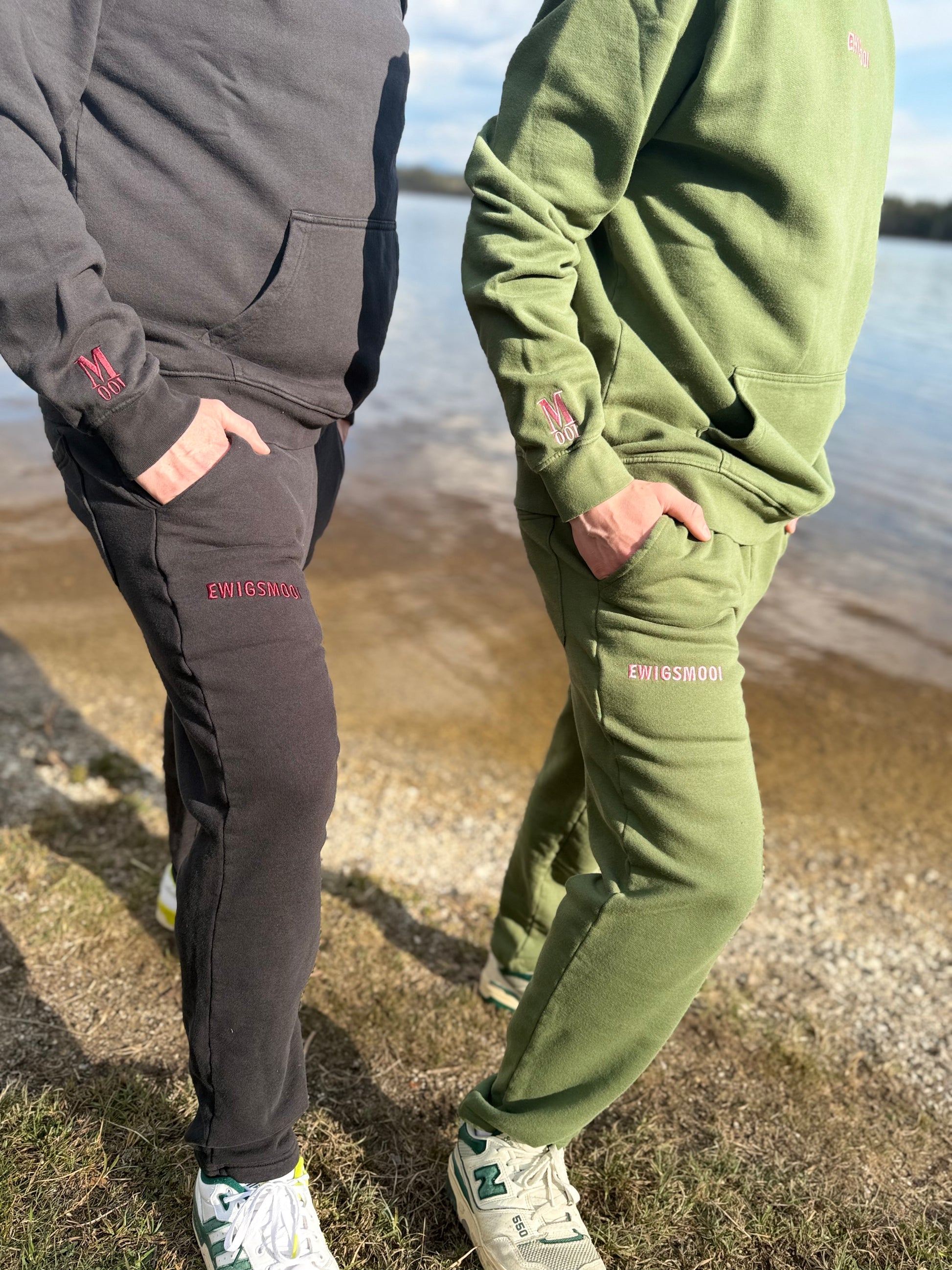 Kim unser Unisex-Jogger, gibt es auch in grün. Im minimalistisches Design mit liebevollen Details. Im Mittelpunkt steht die hochwertige Stickerei EWIGSMOOI in schönem Rose – auf dem rechten Bein und auf der Gesäßtasche.